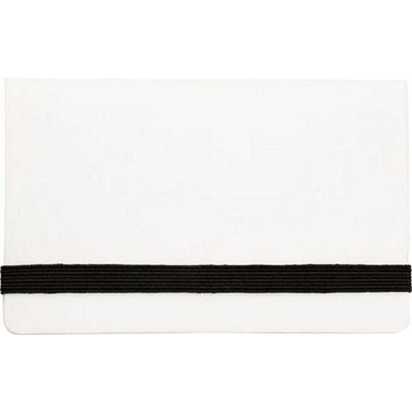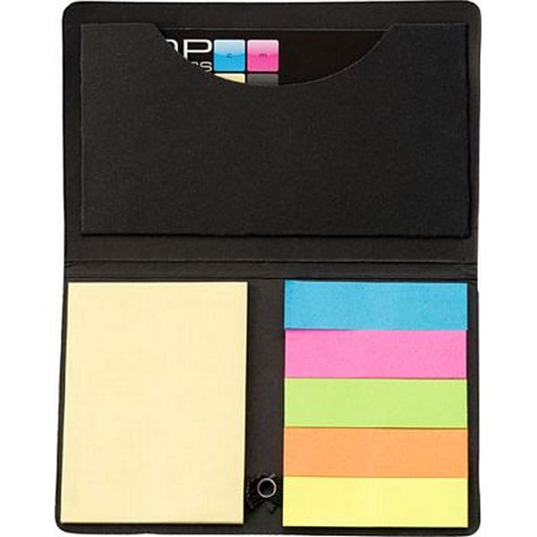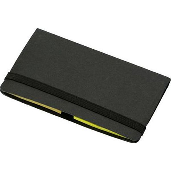 Card case with elastic closing containing one hundred and fifty sticky tabs, a pad and a pocket for a business card.
