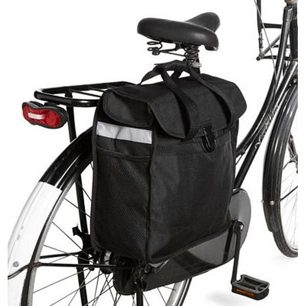 Bicycle bag with mesh pockets on the sides and a reflective safety strip, two carry handles, two plastic hooks and velcro strap for extra fastening. Polyester material.