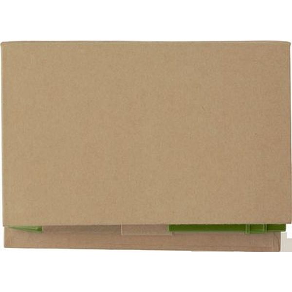 Desk organiser with a business card pocket in the lid, one hundred and fifty sticky memo notes, includes one hundred and sixty plain sheets of paper, pen loop and ballpen with blue ink.