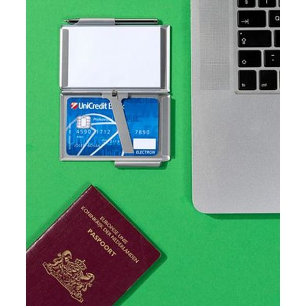 Aluminium business card holder with a fifty sheet note pad and a metal ballpen with blue ink.